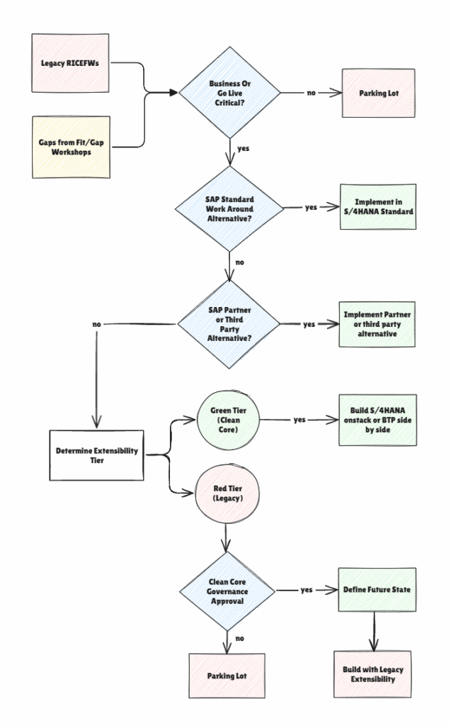 Only after Clean Core Governance signs off, and Program Leadership approves, can a Tier 2 requirement be built using legacy extensibility. Even then, it must come with a Future State Plan essentially a roadmap for deprecation or refactoring when a standard solution becomes available.